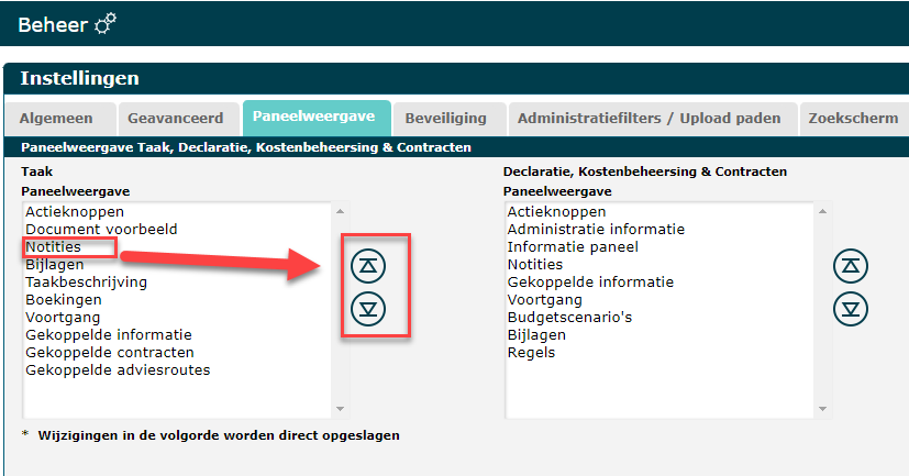 Aan linkerkant kan je de betreffende panelen verplaatsen, zodat deze de gewenste volgorde krijgen. Bij wijziging in volgorde dan is dit direct voor jezelf als beheerder en voor nieuwe medewerkers ingesteld.