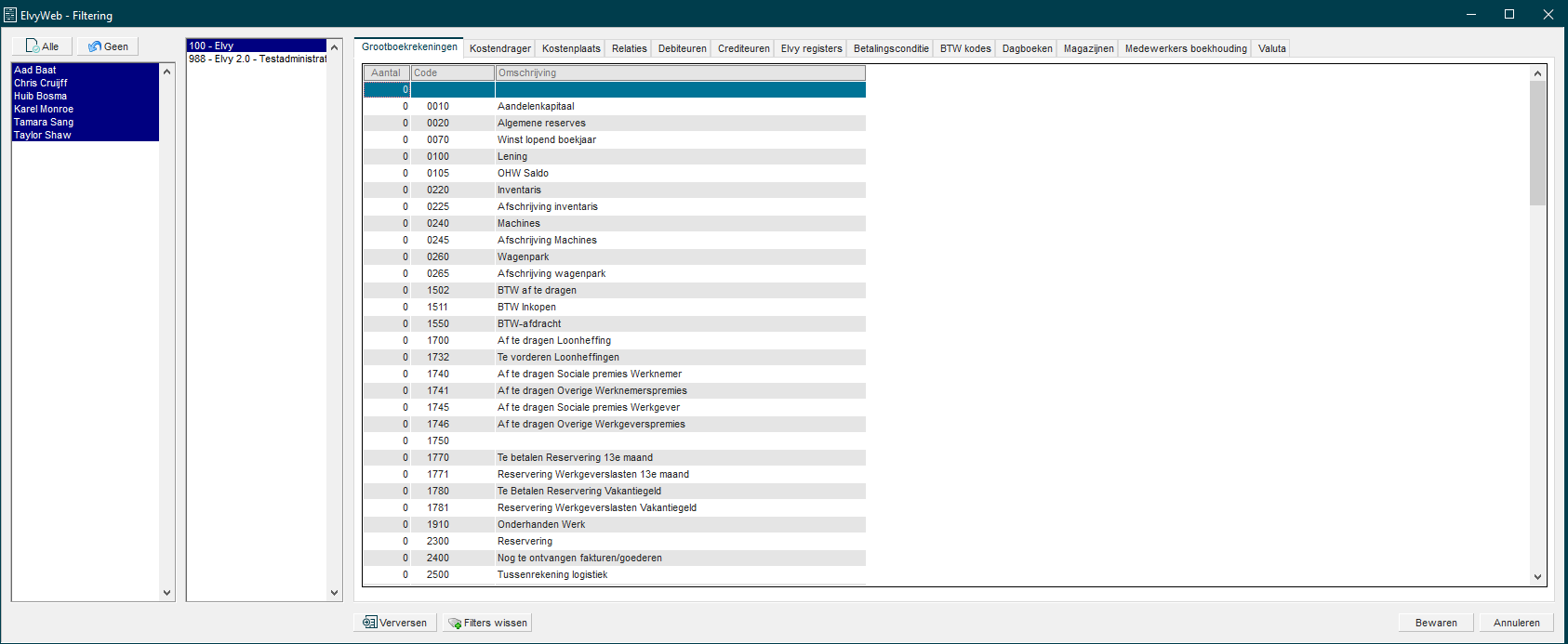 Indien je gebruikmaakt van deze functionaliteit, dan dien je de filtering op een stamgegeven direct in te richten voor alle medewerkers. Wanneer je bijvoorbeeld voor drie medewerkers filtering inricht op een aantal grootboekrekeningen, maar niet voor de anderen, dan krijgen zij geen grootboekrekeningen te zien in de zoek- en invoervelden voor grootboekrekeningen in ElvyWeb totdat je voor hen ook de filtering instelt.