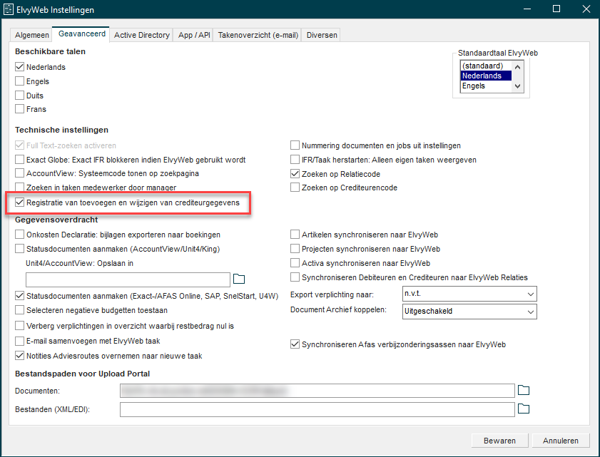 Ga via het menu in Elvy DS naar ElvyWeb > Instellingen. Ga naar het tabblad 'Geavanceerd' en vink hier de optie 'Registratie van toevoegen en wijzigen van crediteurgegevens' aan.