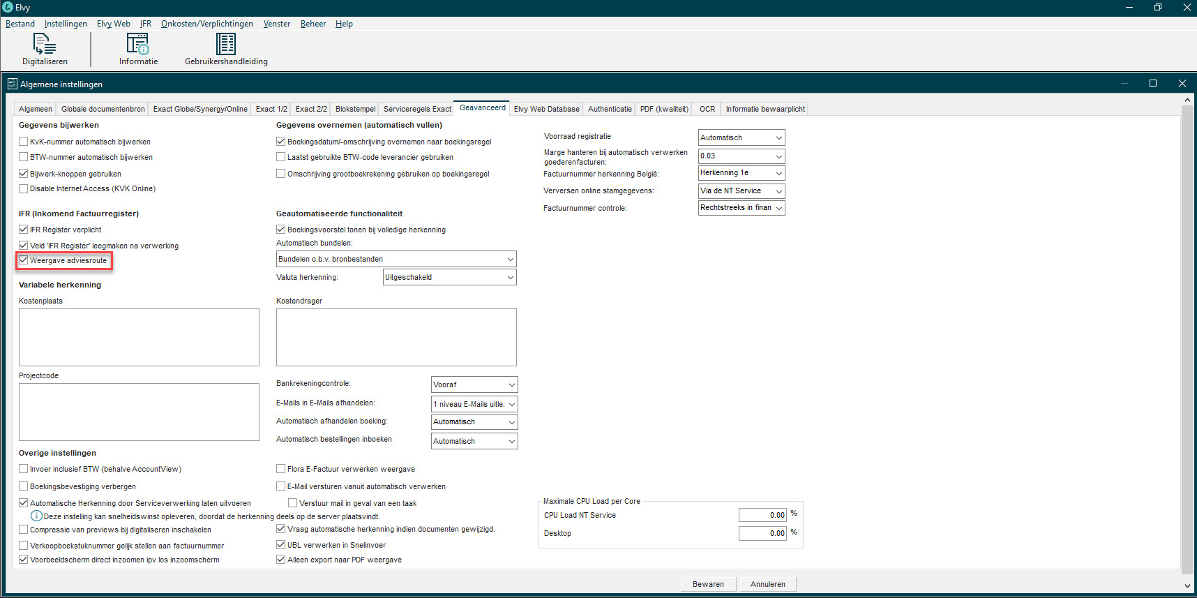 Ga via het menu van Elvy naar Instellingen › Instellingen en open het tabblad Geavanceerd. Onder het kopje 'IFR (Inkomend Factuurregister)' staat de instelling 'Weergave adviesroute' standaard aan. Je kunt deze instelling deactiveren door het vinkje uit te zetten en onderaan op Bewaren te drukken.