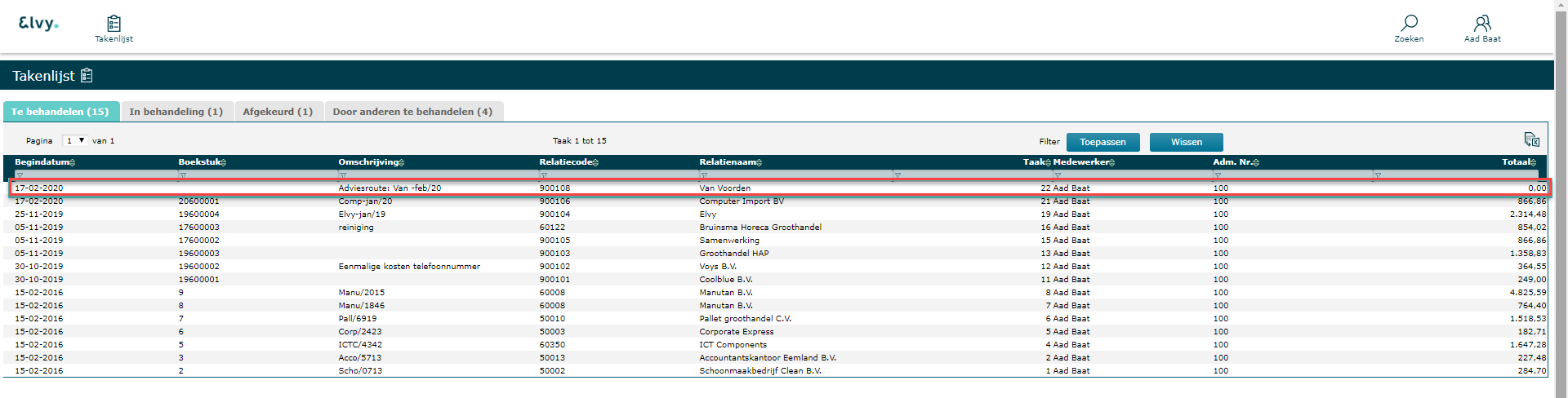 Er wordt op dat moment een nieuwe taak in ElvyWeb aangemaakt, waar de gekozen persoon een antwoord op kan geven. De factuur komt op dat moment weer terug in de rij van te verwerken facturen, met een notitie van het antwoord van de fiatteur/ElvyWeb medewerker.