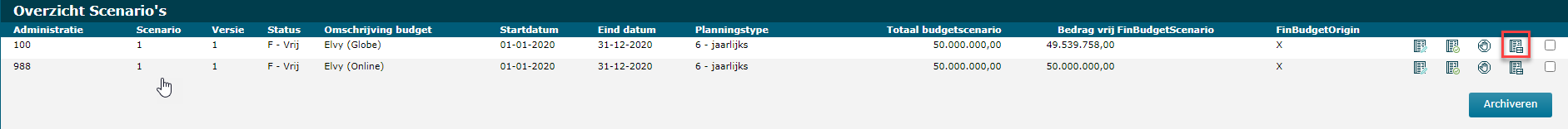 Het gekopieerde scenario verschijnt in de sectie Overzicht Scenario's. In de kolom Beschrijving Budget wordt de originele omschrijving overgenomen met daarachter '- copy'.
