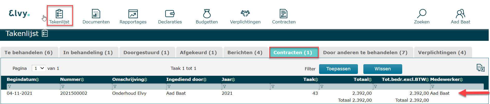 Een collega heeft een nieuw contract ingevoerd en ingediend. Jij wordt als fiatteur, via de takenmail, geïnformeerd dat er een nieuwe taak voor je is. Door op de link in de mail te klikken, opent de taak zich. Je kunt ook vanuit de Takenlijst naar het tabblad Contracten gaan.