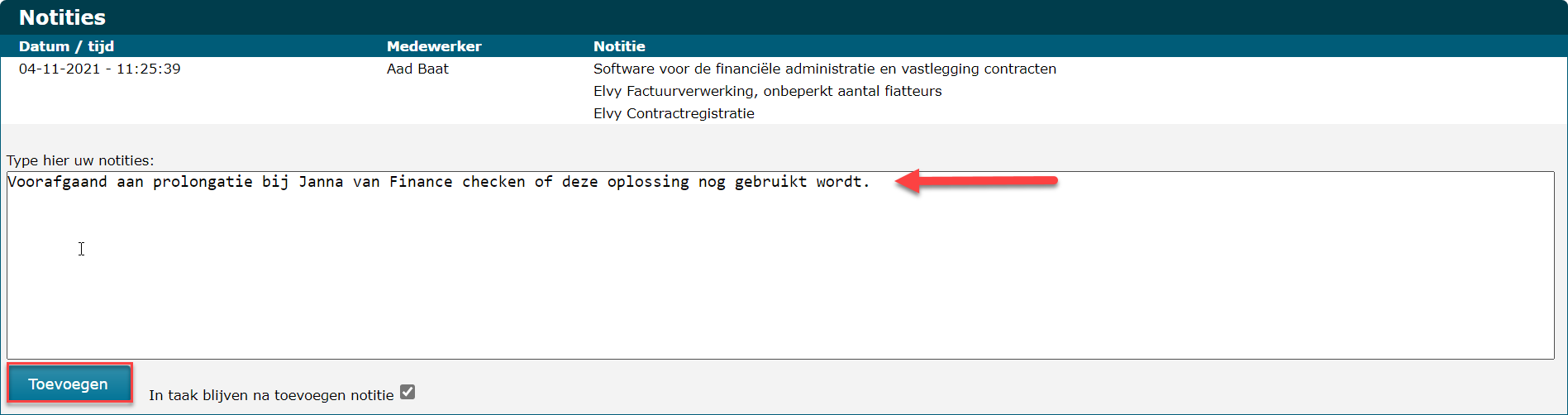 Als fiatteur heb je de mogelijkheid om een notitie toe te voegen op het paneel Notities en daarna bevestig je invoer met de knop Toevoegen.