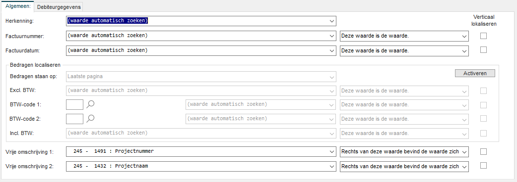 De tekst achter Projectnummer en Projectnaam moeten in de omschrijving standaard meegenomen worden. In de lijsten kies je deze waarden met de optie Rechts van deze waarde bevind de waarde zich.