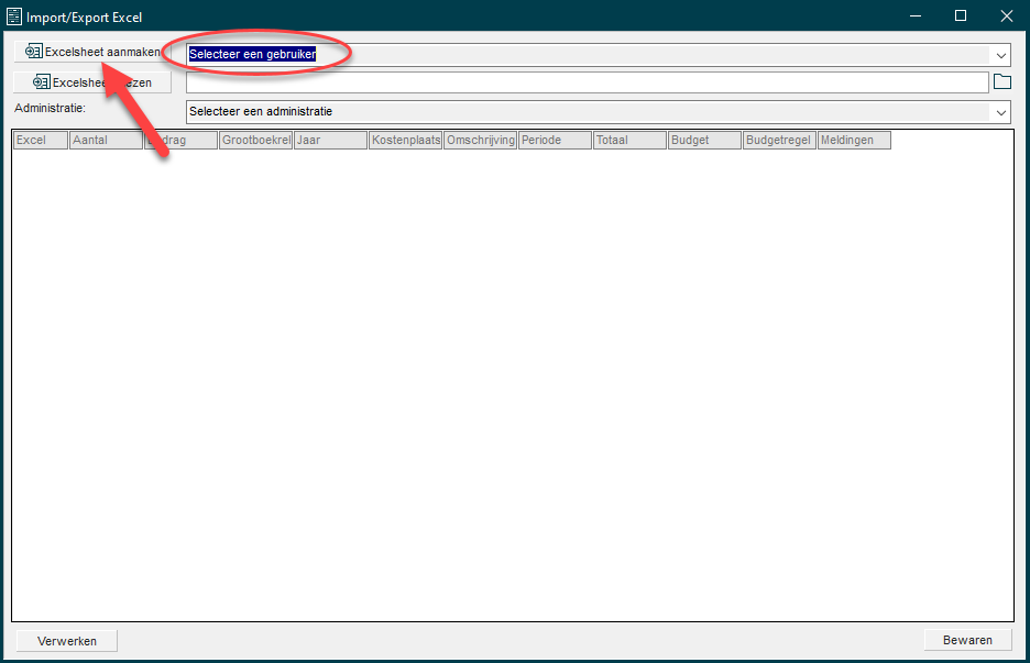Selecteer vervolgens de gebruiker onder wie de verplichting aangemaakt moet worden en klik op Excelsheet aanmaken om de sheet aan te maken die gebruikt moet worden voor de import: