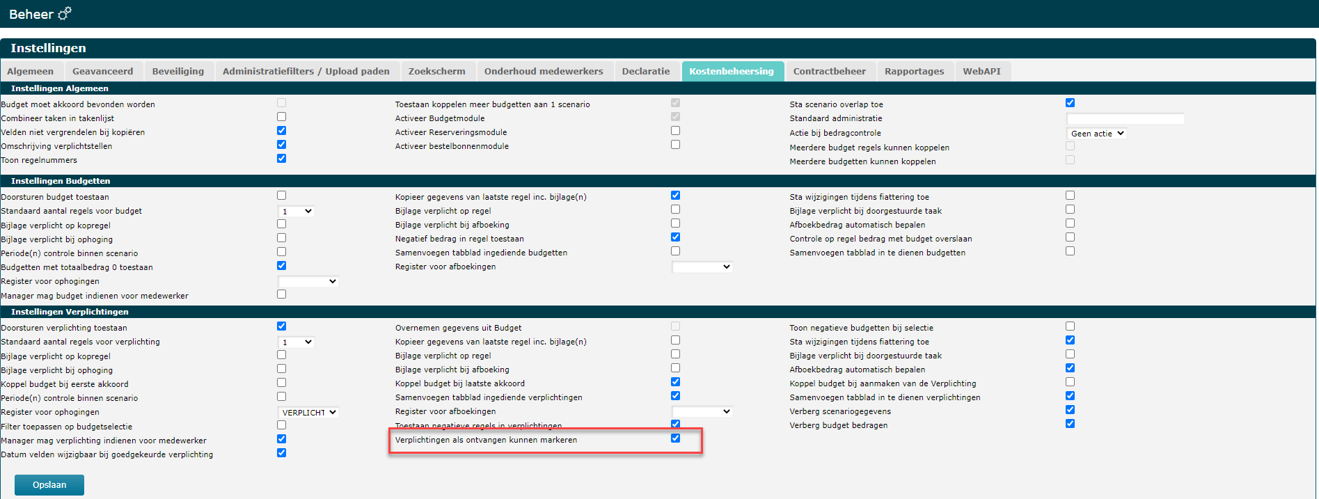 Ga naar het tabblad Kostenbeheersing en zet de optie aan bij: Verplichtingen als ontvangen kunnen markeren