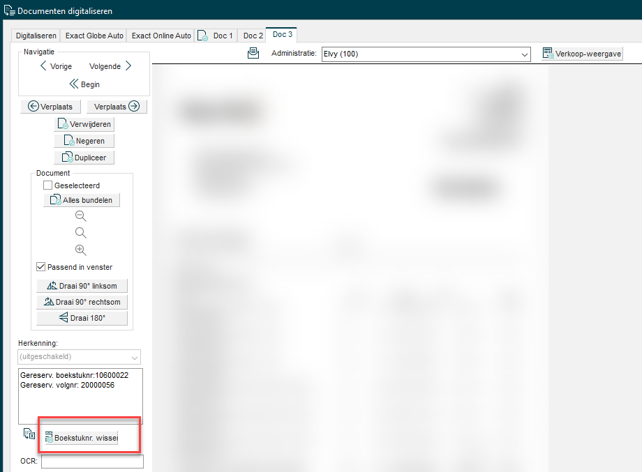 Ga op het document zelf staan. Hier zou je, net als in het voorbeeld, een gereserveerd boekstuknummer gekoppeld moeten zien: