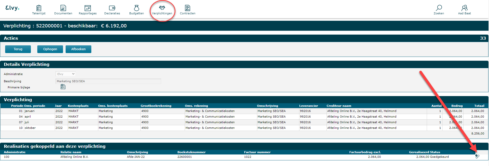 Wanneer een factuur gekoppeld is aan verplichting of budget, dan ontkoppel je deze door naar de betreffende verplichting te gaan. Na het openen van de verplichting klik je op de knop achter de realisatieregel om de realisatie te ontkoppelen:
