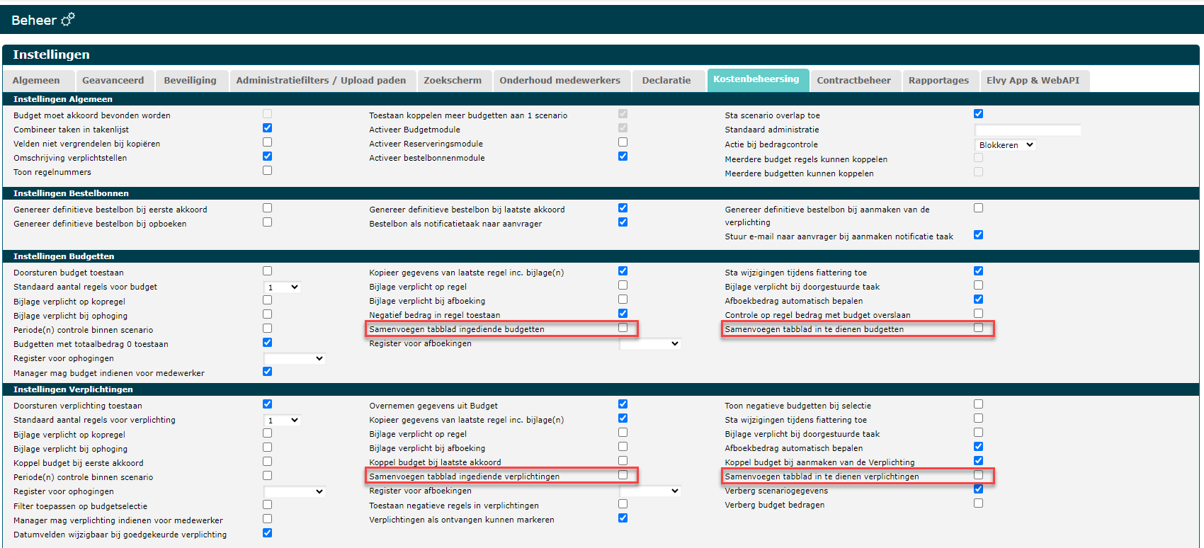 De configuratie kan alleen gedaan worden door een gebruiker die zowel beheerder is in ElvyWeb als modulebeheerder Kostenbeheersing & Verplichtingen.