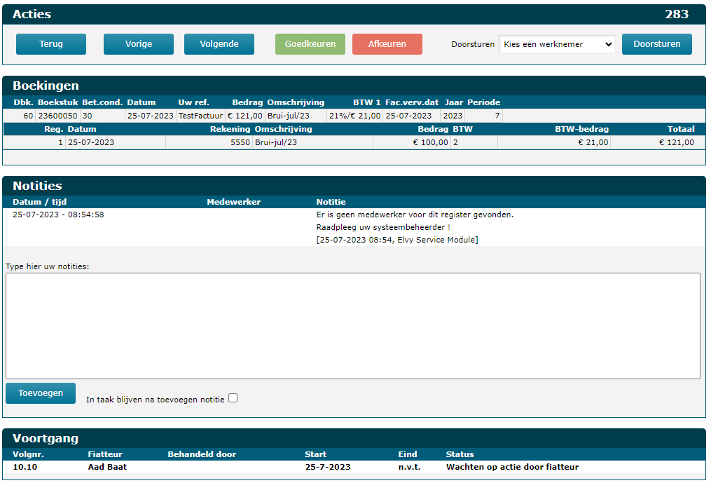 In dit voorbeeld is een factuur geboekt van €121,00 op grootboekrekening 5550:De volgende melding komt bij de notities te staan: