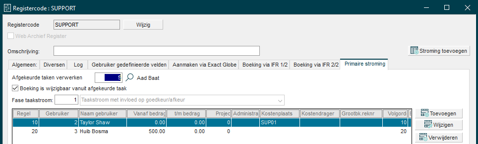 Ga in dit register naar het tabblad 'Primaire stroming' en controleer op basis van de gemaakte boeking of er inderdaad geen medewerker gekozen kan worden.