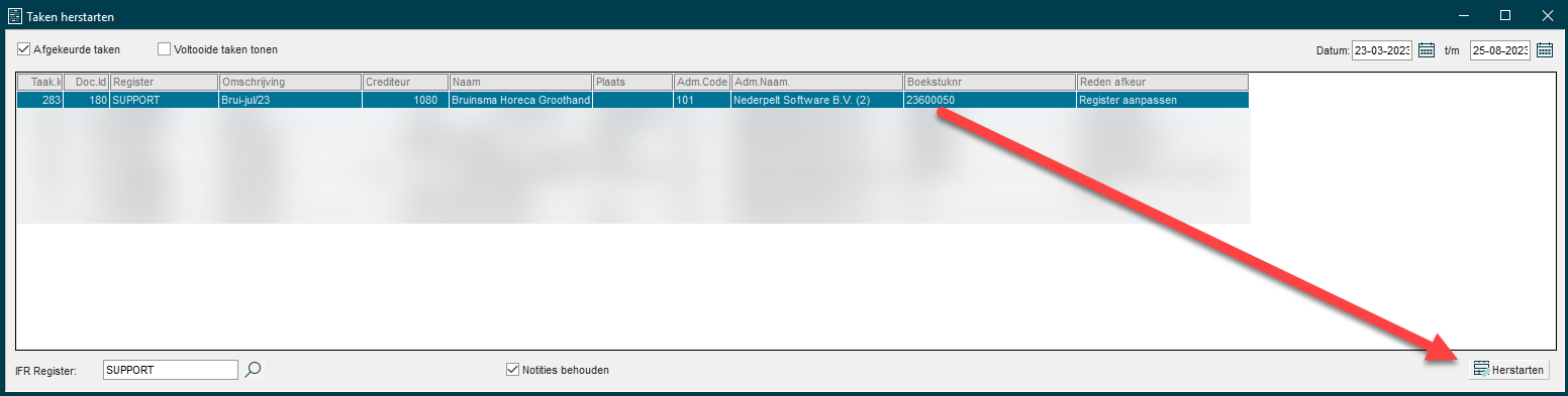 Een taak kan op hetzelfde register herstart worden om ervoor te zorgen dat de nieuwe configuratie gebruikt kan worden. Dit is uit te voeren vanuit ElvyDS via het menu 'IFR - Taak herstarten'.